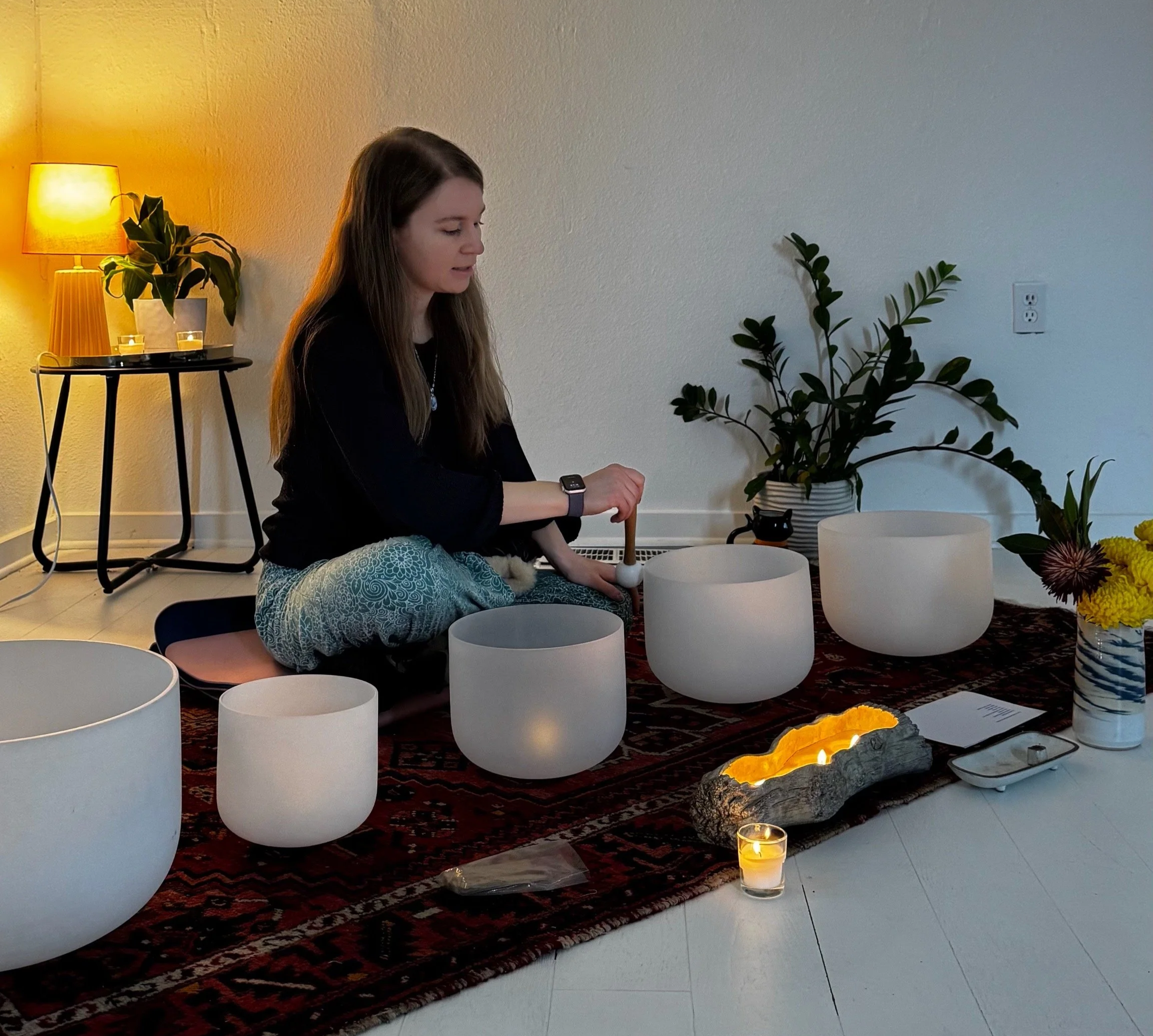 Heather Anne earned her 200-Hour Yoga Teacher Certification through Satya School of Yoga and has been teaching for over 8 years, offering classes in asana, pranayama, meditation, and sound healing — including immersive crystal singing bowl sound baths for individuals and groups.
